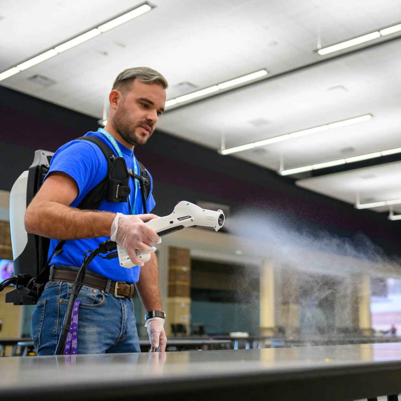 Den elektrostatiska sprayen fördelar vätskan 360 grader runt ytan som sprutas mot. Det ger en desinficerande beläggning som ger 3x mer täckning än traditionella sprayflaskor, hinkar eller trasor.
