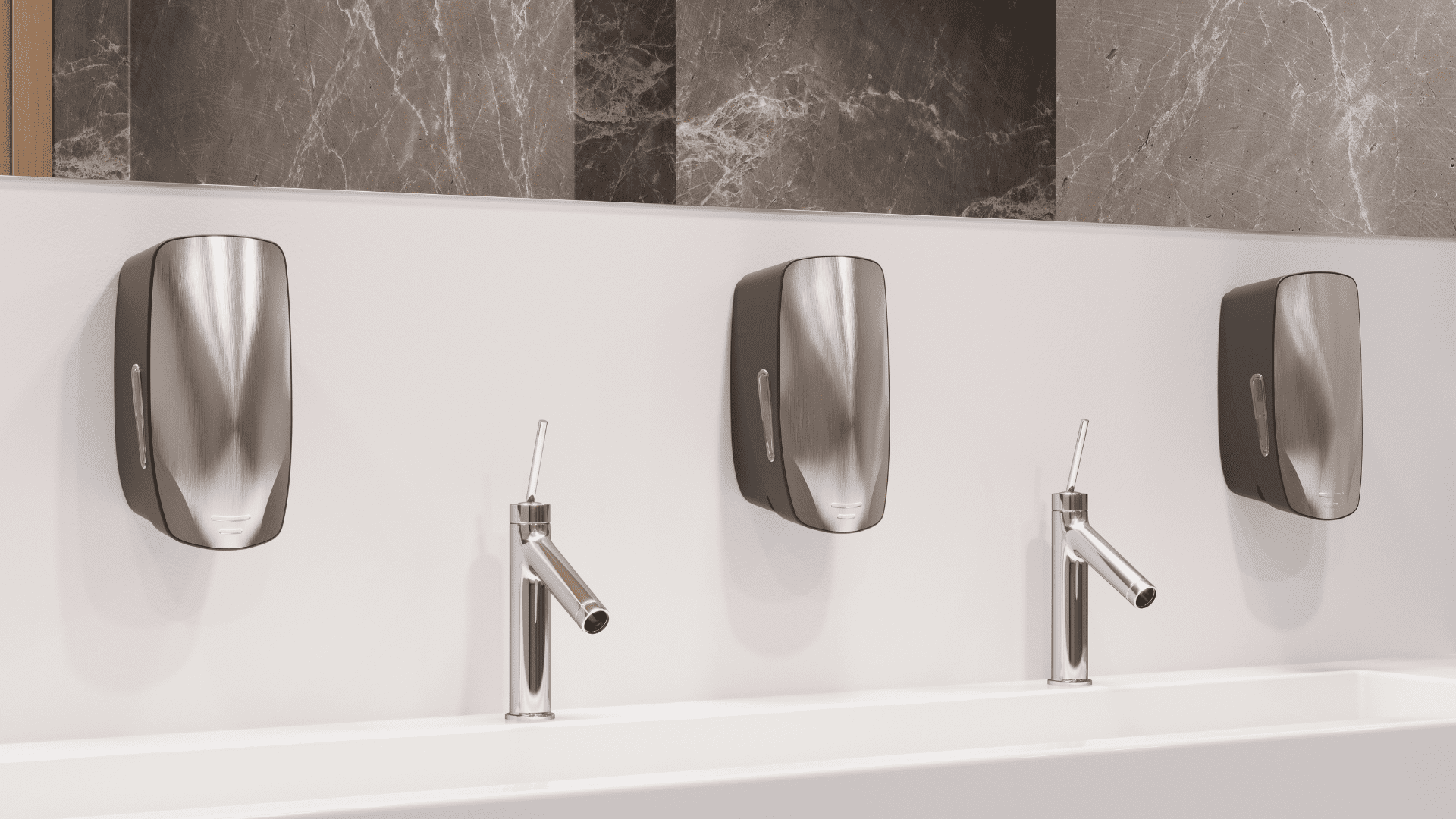 Ståldispensern i grå är klassisk och modern, och dess finish i rostfritt stål ger varje toalett en känsla av lyx. Dispensern finns med en pump för skumtvål och för flytande tvål, och har en tank på 900 ml som enkelt kan fyllas på när tvålnivån är låg (tvålnivån kan avläsas på sidan av dispensern).